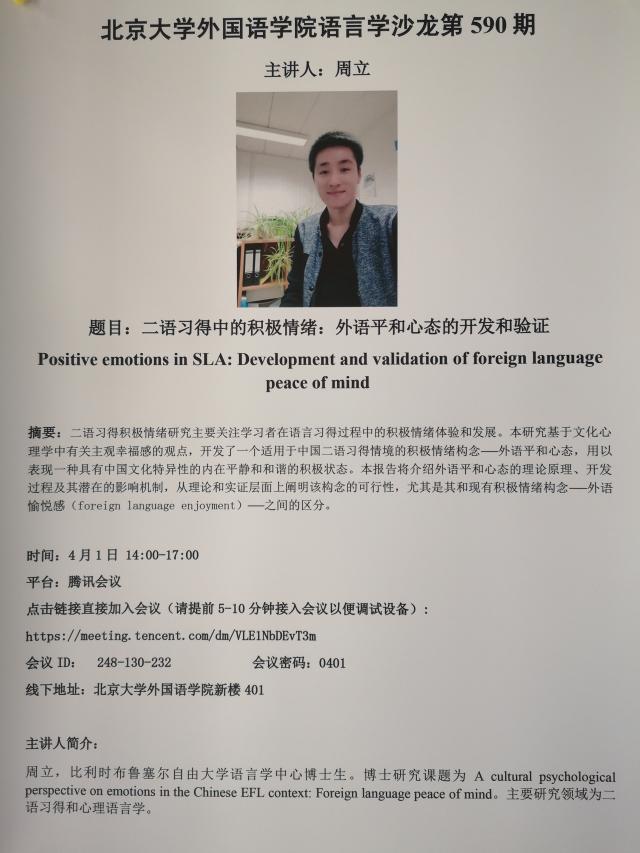 开云官方在线入口语言学沙龙第590期 二语习得中的积极情绪:外语平和心态的开发和验证