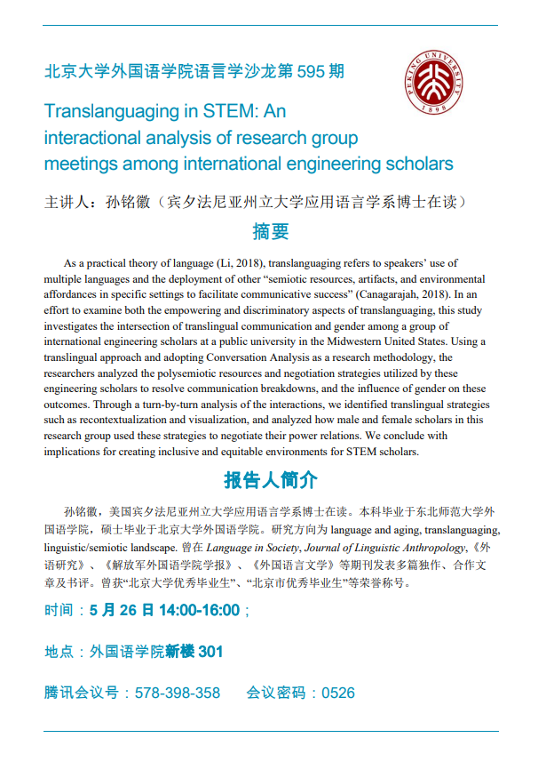 服务导航 开云官方在线入口语言学沙龙第595期:Translanguaging in STEM:An interactional analysis if research group meetings among international engineering scholars 2023-05-21