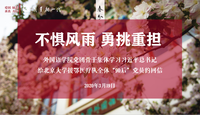 3月15日,习近平总书记给北京大学援鄂医疗队“90后”党员回信,向他们和奋斗在疫情防控各条战线上的广大青年致以诚挚的问候,勉励广大青年不惧风雨、勇挑重担,让青春在党和人民最需要的地方绽放绚丽之花。为学习和贯彻总书记的回信精神,外国语学院组织多场主题活动,带领师生分层次深入学习。总书记的深情寄语和殷切嘱托,在外国语学院师生中引起强烈反响和热烈讨论。