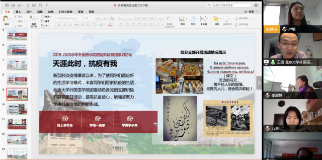 王恒分享了外院的基本情况和防疫工作概况。通过播放外院20周年院庆视频,王恒介绍了北大外院的发展历程和基本情况。此次疫情中,外院各党团支部共开展近200次党团日活动,集体学习习近平总书记的两次回信精神,并开展了专题讲座、“同桌计划”、线上K歌大赛等文体活动,陪伴同学们的居家生活;外院学子还积极投身防疫的志愿服务,通过借助专业翻译防疫物资、无偿献血等方式为抗击疫情做贡献。王恒希望外院同学和来凤同学同心协力、攻克时艰,互相陪伴,一起成长。