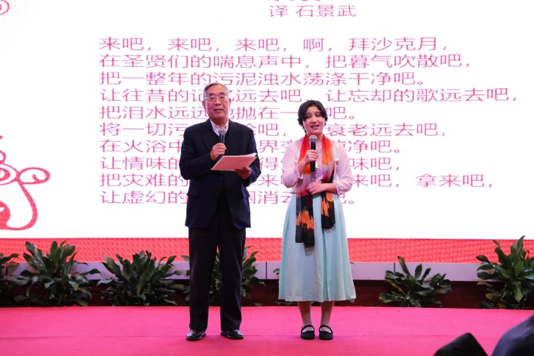 语言中心公共孟加拉语课程的师生献上了一首孟加拉语歌曲《来吧,来吧,拜沙克月》,歌词由语言中心孟加拉语教师石景武先生翻译,现场优美的吉他伴奏声与歌声让观众领略了孟加拉语的独特魅力,也送上了新年的赞歌。