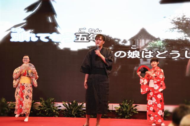 日语系葛奇蹊、刘莹和张晶老师共同演绎了著名的日本民歌《北国之春》,低沉的歌声娓娓道来,唱出了北国春天的美景与游子思乡的深情,穿着和服的伴舞更增添日本之韵味,呈现了一曲好看好听的演歌。