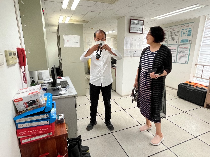 张冬梅老师在物业工作人员的陪同下首先对新楼的中控室进行了检查。物业人员表示,为了应对汛期紧急情况,物业已于此前购置了防汛应急物资,如头灯、应急防水服以及雨鞋等装备。物业工作人员还进行了头灯使用的操作示范,头灯可以在汛期突发停电等意外情况时为工作人员提供应急照明服务,在一定程度上保证工作人员的操作安全。
