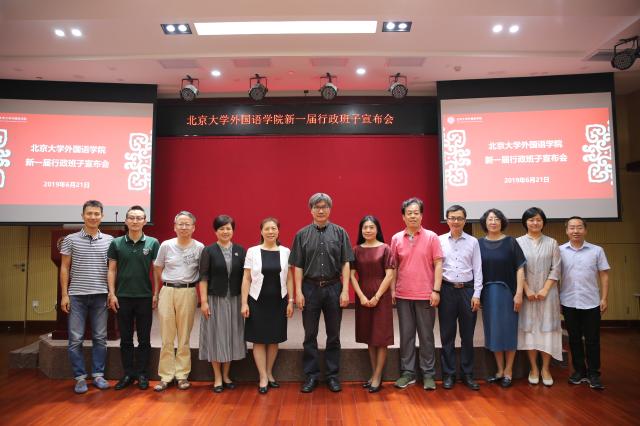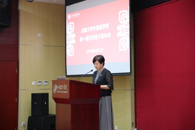 2019年6月21日,外国语学院召开行政班子换届宣布会,北京大学党委常委、副校长王博,党委常委、组织部部长柴真及组织部有关同志出席会议,学院全体行政班子成员及百余名教职工参加了宣布会。会议由学院党委书记李淑静主持。