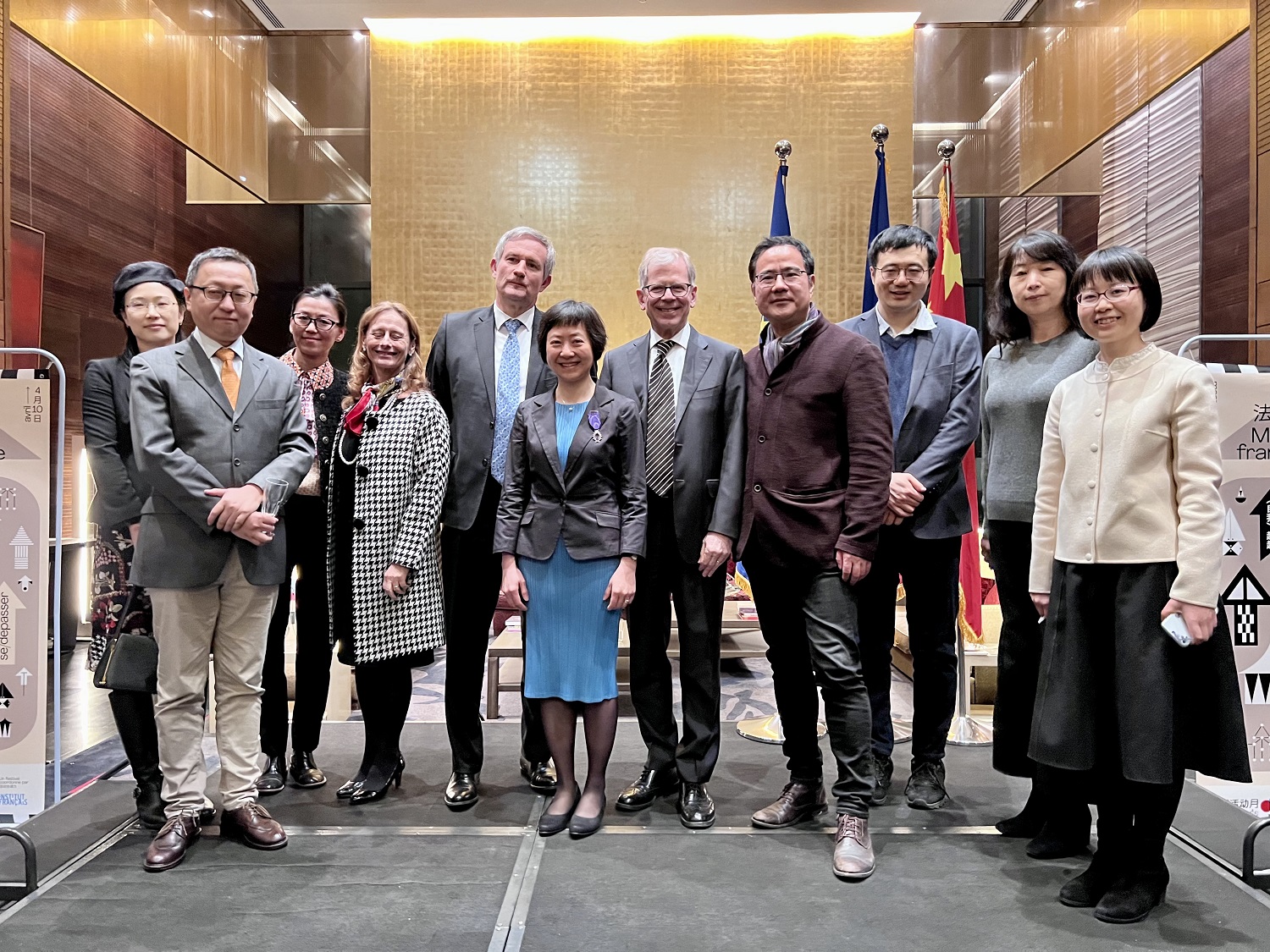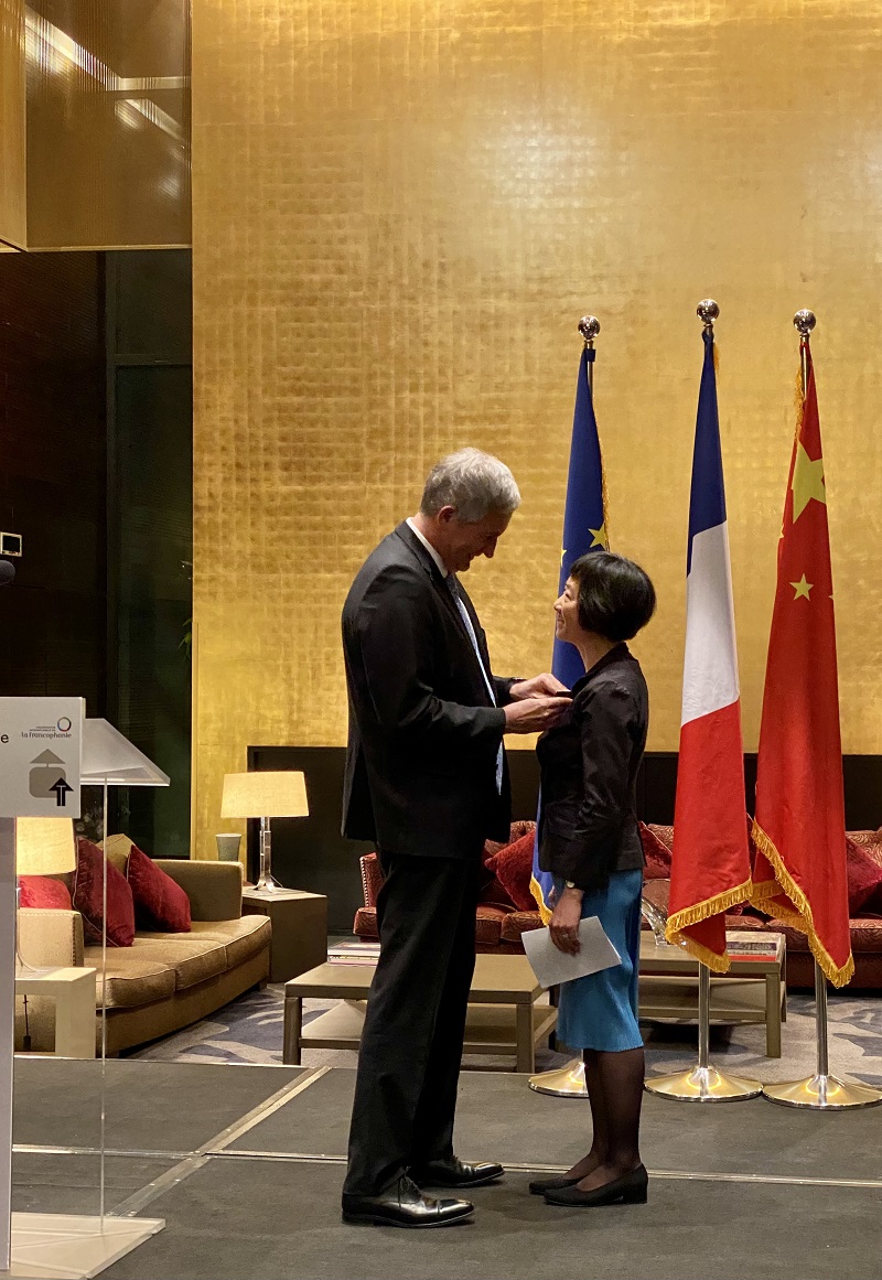 2022年3月17日晚,法兰西共和国“学术棕榈”(les Palmes académiques)骑士勋章的授予仪式在法国驻华大使官邸举行。法国驻华大使罗梁(Laurent Bili)阁下代表法国政府,为开云官方在线入口学术委员会委员、法语系段映虹教授颁发了法兰西共和国“学术棕榈”骑士勋章。当晚正值“2022年国际法语日” (Journée internationale de la Francophonie 2022)庆祝活动,来自外交、教育、体育、艺术与文化各领域的中外嘉宾齐聚一堂。法语国家大使组织主席、瑞士驻华大使罗志谊(Bernardino Regazzoni)阁下,欧盟驻华代表团团长、著名汉学家郁白(Nicolas Chapuis)阁下及各法语国家驻华使节,段映虹老师的亲朋好友出席了授勋仪式。