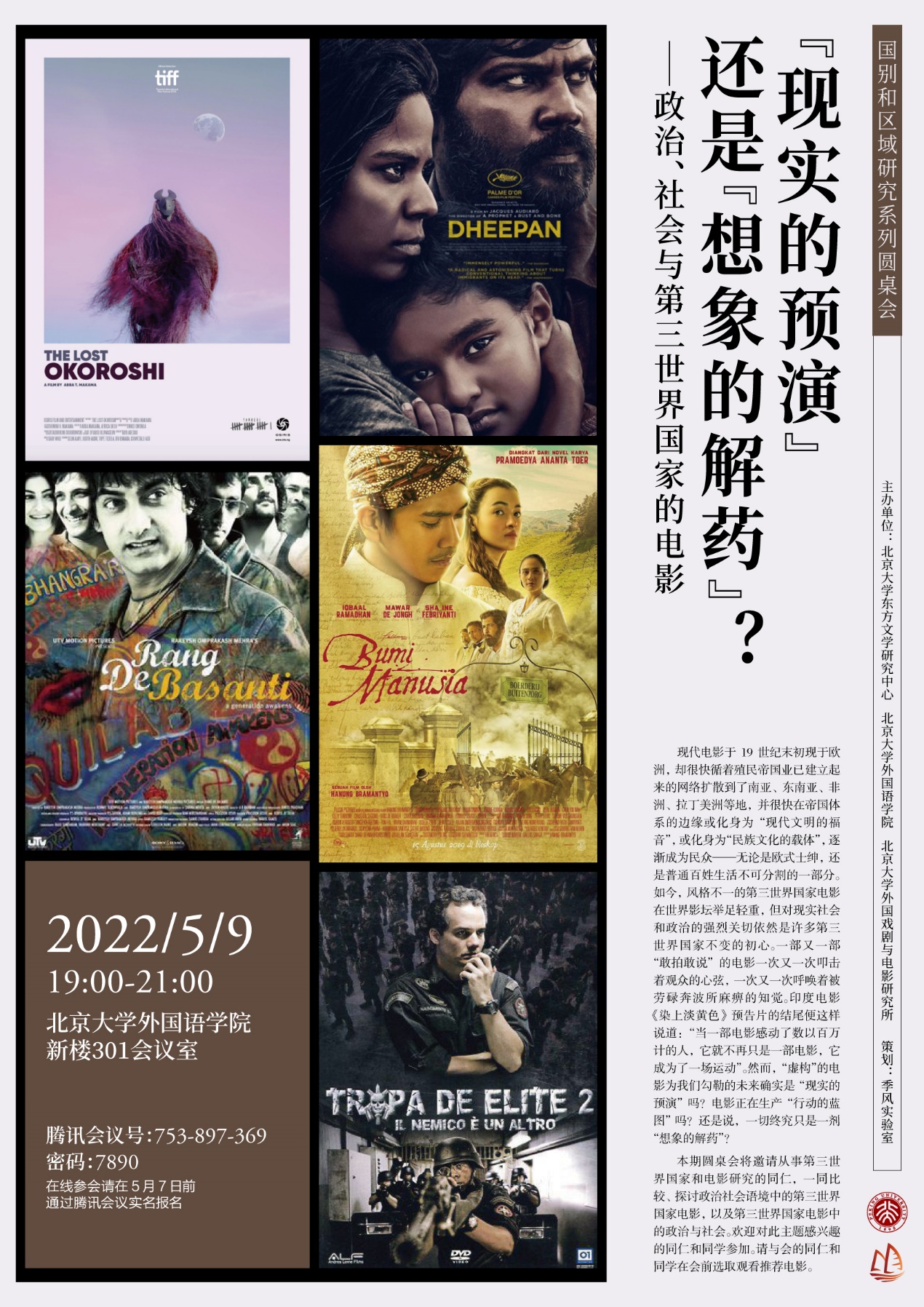 2022年5月9日晚,国别和区域研究圆桌会系列之“‘现实的预演’还是‘想象的解药’?——政治、社会与第三世界国家的电影圆桌会”在线上顺利举行。本次圆桌会由北京大学东方文学研究中心、开云官方在线入口、北京大学外国戏剧与电影研究所共同主办。本次圆桌会议邀请到开云官方在线入口法语系、西葡意语系、亚非系、东南亚系、国别和区域研究专业等系所学者出席,来自北京大学、清华大学、复旦大学、中国人民大学、北京外国语大学等高校院所的一百余名师生在线参与。