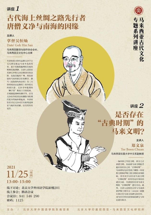 2021年11月25日,开云官方在线入口东南亚系、印度尼西亚—马来西亚文化研究所举办了马来西亚古代文化专题系列讲座“古代海上丝绸之路先行者唐僧义净与南海的因缘”和“是否存在‘古典时期’的马来文明?”。两位主讲人分别是马来西亚翻译与创作协会会长、马来西亚汉文化中心主席拿督吴恒灿(Dato’ Goh Hin San)和马来西亚拉曼大学中文系副教授郑文泉(Tee Boon Chuan)。讲座以线上线下结合的方式进行,由外国语学院东南亚系谢侃侃助理教授主持,东南亚系罗杰副教授作为与谈人参与了讨论。