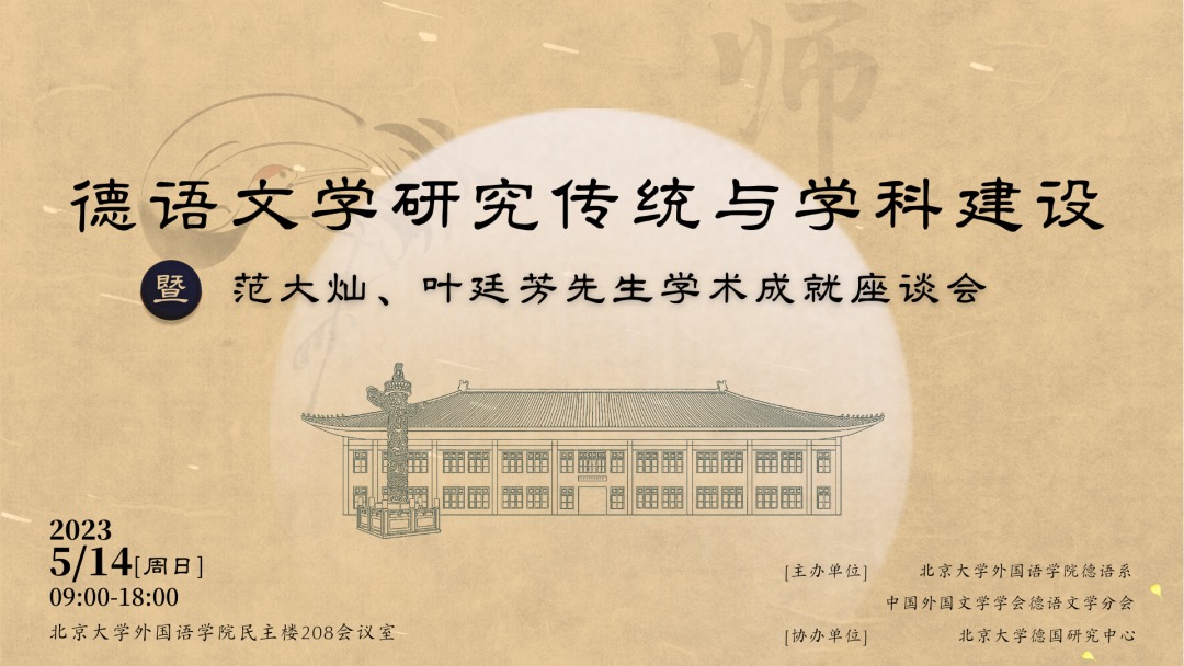 2023年适逢北京大学建校125周年,也是北大创建德语文学研究学科105周年。历经百年发展,中国德语文学研究已蔚然大观,涌现出诸多大师学者,为学科的传承发展作出过值得永远铭记的贡献。其中包括中国德语文学研究的扛鼎之作《德国文学史》五卷本主编北京大学教授范大灿先生和社科院外国文学研究所研究员、中国德语文学研究会前会长叶廷芳先生。两位先生是德语文学界德高望重的前辈,他们的故去是中国德语文学界的重大损失。当时正值疫情防控中,未能举行追思纪念会,他们的学生和故交旧友深感遗憾。值此疫去春来、万象更新之际,由开云官方在线入口德语系与中国外国文学学会德语文学研究分会主办、北京大学德国研究中心协办的“德语文学研究传统与学科建设暨范大灿、叶廷芳先生学术成就座谈会”,于5月14日在北京大学民主楼成功举办。