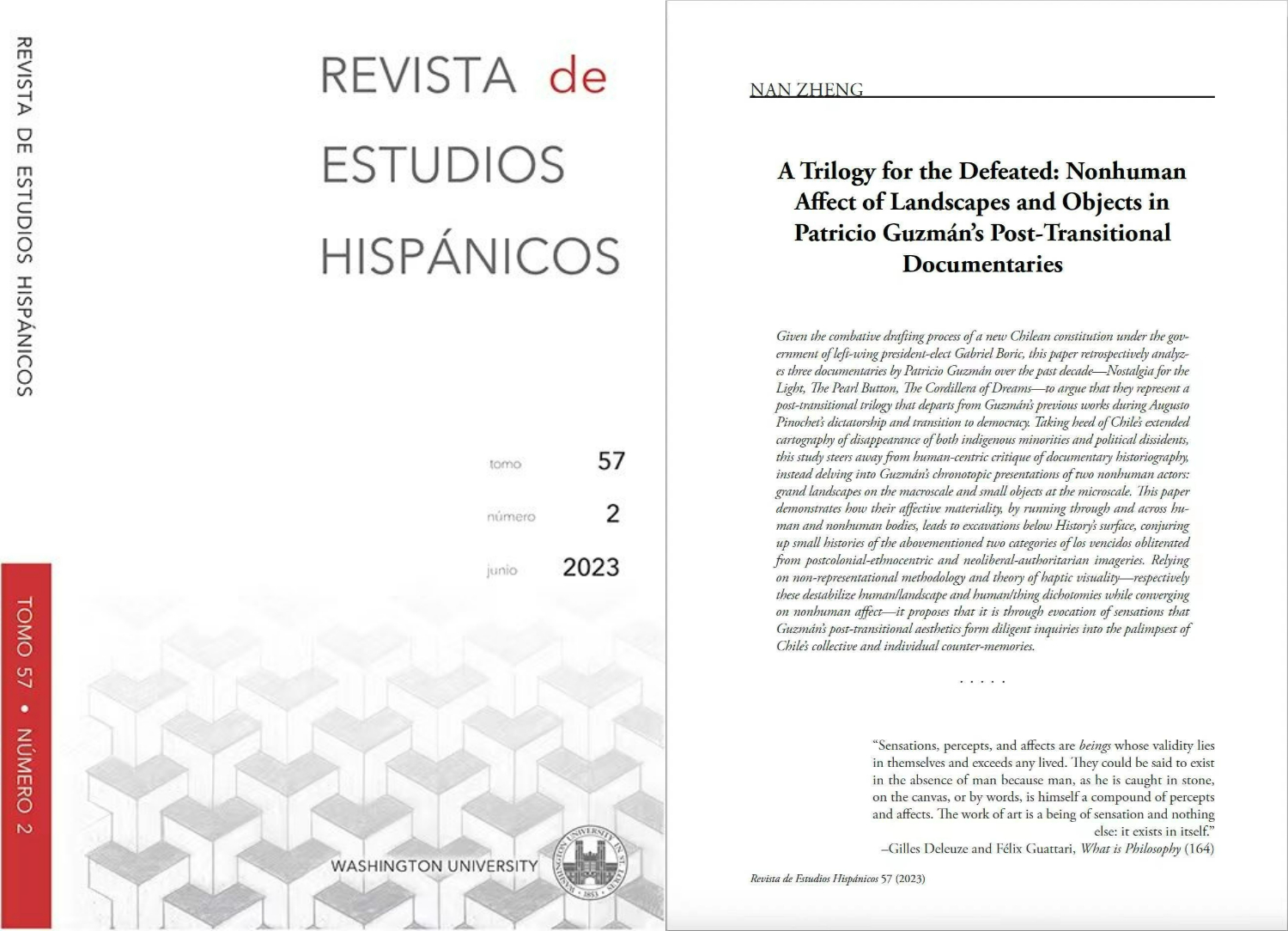 开云官方在线入口西葡意语系助理教授郑楠作为唯一作者的学术研究型论文《献给战败者的三部曲:帕特里西奥·古斯曼民主过渡后纪录片中风景与物件的非人类情动》(“A Trilogy for the Defeated: Nonhuman Affect of Landscapes and Objects in Patricio Guzmán’s Post-Transitional Documentaries”),近期在A&HCI来源期刊《西班牙语世界研究期刊》( Revista de Estudios Hispánicos )2023年第2期刊登。《西班牙语世界研究期刊》由美国圣路易斯华盛顿大学罗曼语语言文学系主办,采用严格的多轮匿名审稿制度,刊登西班牙语国家和地区文学和文化研究、电影研究和文艺理论批评研究等方向的西班牙语或英语学术论文。该期刊现位列JCR期刊引证报告罗曼语文学研究类一区,是国际学术研究界公认的权威期刊。郑楠老师的论文是该期刊自1967年创刊以来中国学者的首次发表,也是国际权威学术期刊第一篇整体研析古斯曼纪录片三部曲并尝试命名的学术研究型论文。