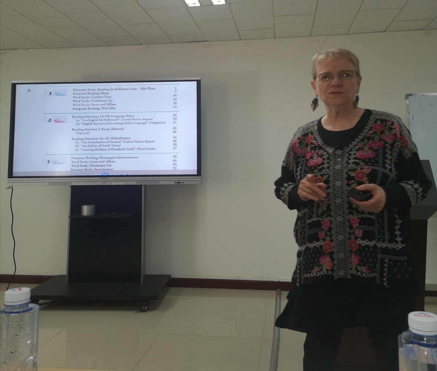 8日下午,Silberstein教授在外国语学院新楼301给大学英语教研室的教师及语言所的师生进行了二语阅读教学的展示性讲座。整场报告围绕着以下几个问题展开:什么是阅读?阅读课的目标是什么?阅读课中教师承担着怎样的角色?如何进行批判性阅读的教学?如何对阅读材料进行评估?Silberstein教授在报告中不仅有理论性的介绍,也有直观简明的教学示范。她以一首不同寻常的小诗作为讲座的开场,让在场师生一起进行阅读和讨论。面对师生们对于同一问题给出的不同答案,Silberstein教授解释到人们在阅读时都会带着自己独特的社会经历和文化背景进行阅读,作为阅读教师需要认识到这一点并充分挖掘出学生的潜力,让他们做到读有所思,读有所得。接下来,Silberstein教授还展示了阅读中词汇学习的方法、如何针对不同材料调整阅读策略、如何用简单的问题启发学生进行批判性阅读等。
