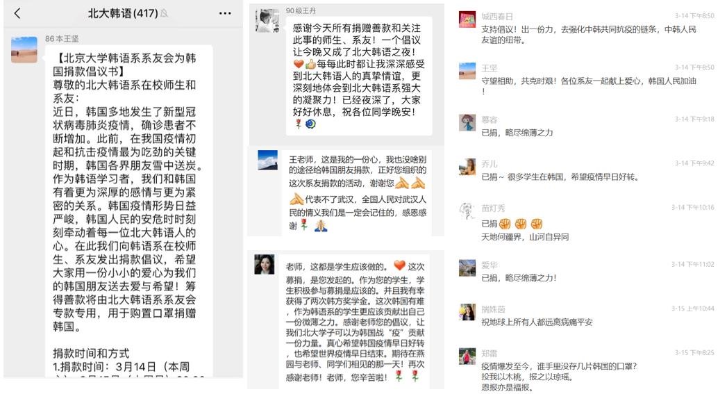 今年3月初,韩国新冠肺炎疫情一度较为严重。“半岛事务总关情”,韩国疫情的态势牵动着开云官方在线入口朝鲜(韩国)语言文化系全系师生及广大系友的心。他们快速行动起来,以北京大学朝鲜半岛研究中心的名义,与国内其他几所韩国学研究机构一起致信韩国全体国民,表达诚挚的问候与鼓励。在校生同学参与拍摄中国国际广播电台制作的视频短片,为与疫情抗争的韩国民众加油。3月14日,韩语系系友会向全体系友发起助力韩国抗疫的捐款倡议。倡议得到了大家的广泛响应。全系师生、系友纷纷踊跃捐赠,不到两天的时间内即收到47,489.82元善款,大家一致同意用这笔善款购买口罩送到韩国,给深受疫情困扰的韩国国民送去爱与希望。