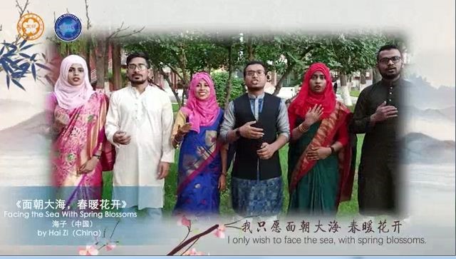 泰戈尔创办的印度国际大学中国学院以及孟加拉国达卡大学学生用中文诵读了巴金散文《月》、鲁迅散文《雪》、海子抒情诗《面朝大海,春暖花开》、郑愁予现代诗《错误》等名篇。