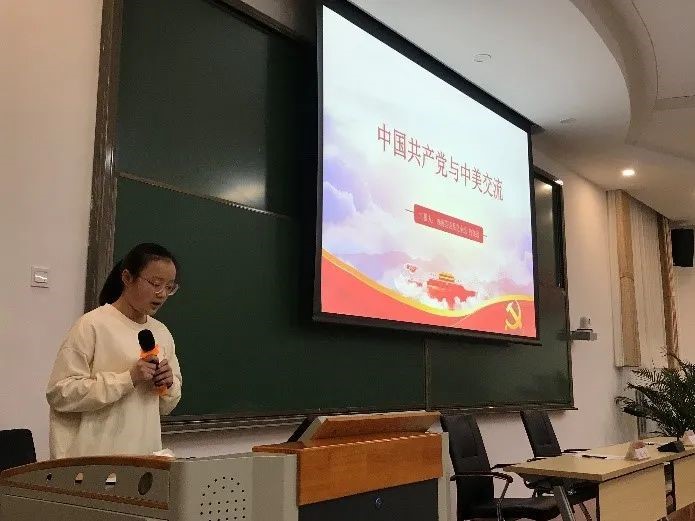 2018级英语系2组首先为同学们梳理了1921年以来党的大事件。主讲人张心怡将内容大致分为六个部分,以中国共产党成立、井冈山革命根据地建立、抗日战争、中华人民共和国成立、社会主义现代化建设、改革开放、建设中国特色社会主义伟大事业为节点,为大家详细地介绍了党的百年历程。随后2017级英语系党小组则为同学们介绍了习近平新时代中国特色社会主义思想,不仅介绍了习近平总书记与党史的关系,还分析了十八大、十九大会议的重要内容与精神,展示了新时代以习近平同志为核心的党中央的精神对中共、对世界马克思主义运动的伟大意义。而2018级英语系1组与2019级英语系党小组则分别从中英、中美的角度论述了两国关系在百年间由不平等走向合作与竞争的重大变化,突出了党对于我国发展与复兴不可或缺的领导作用。