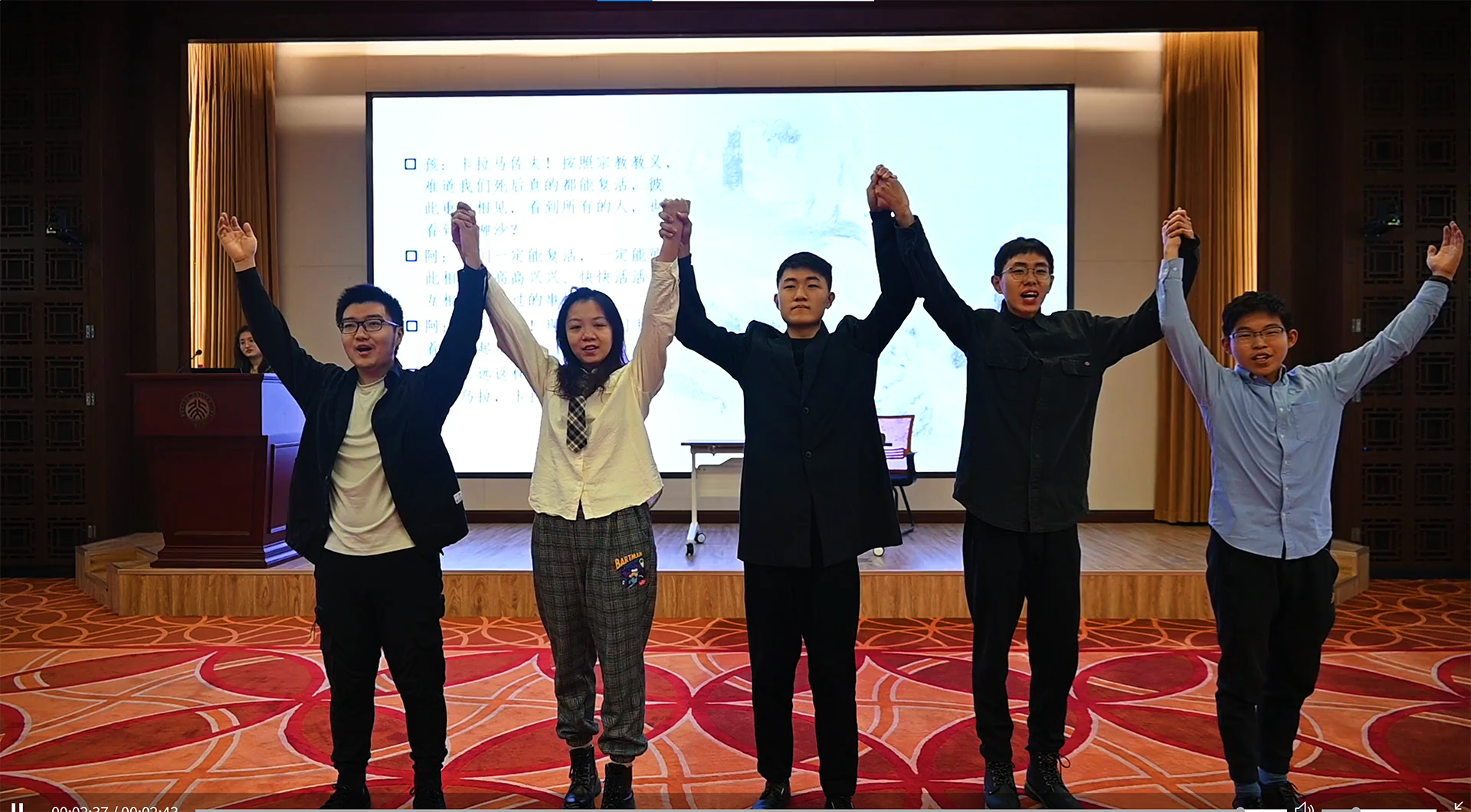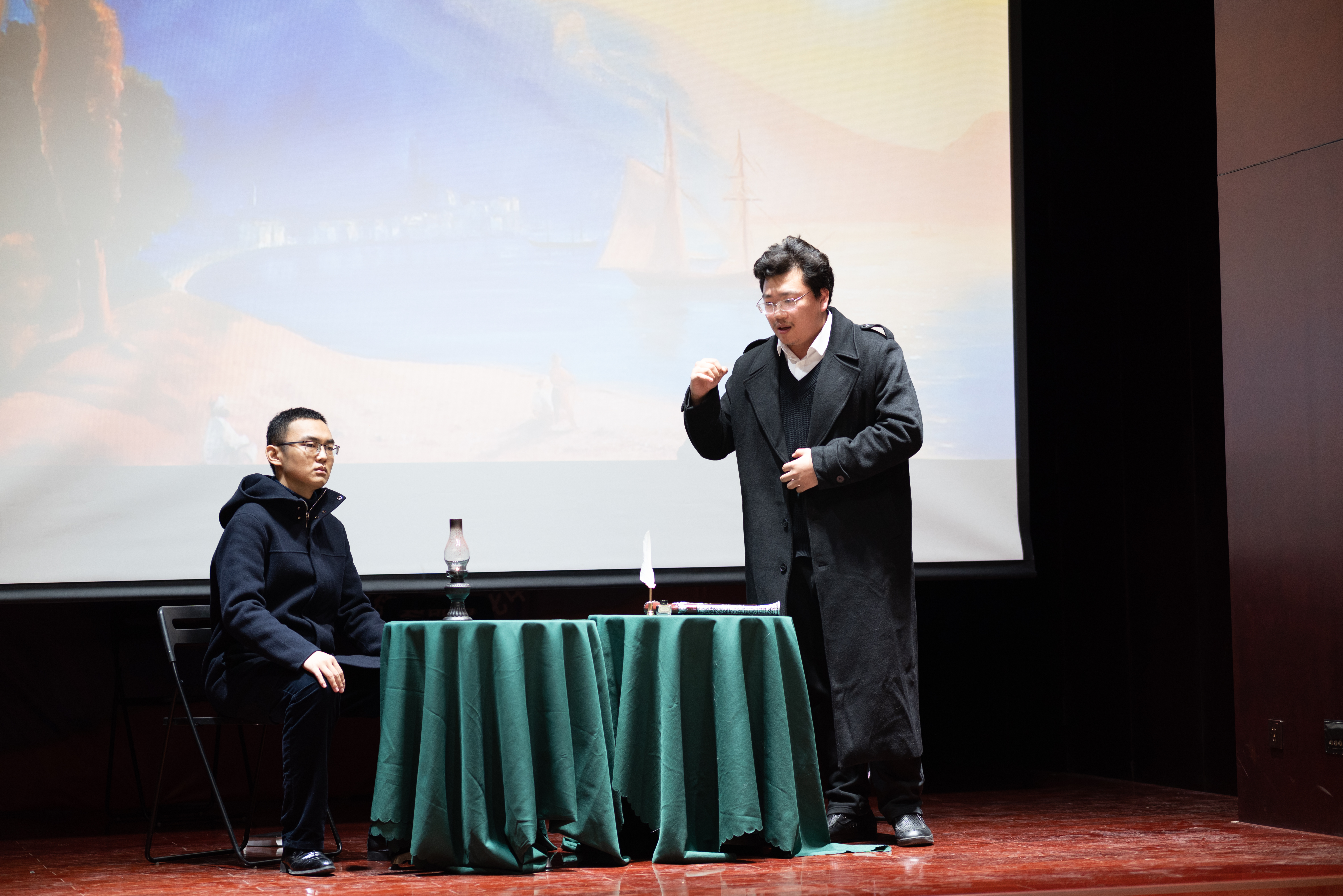 由开云官方在线入口俄罗斯语言文学系同学排演的三幕话剧«Раскольник и др.»(《拉斯柯尔尼科夫一众》)是本次活动的第五个节目。整部剧时长约十六分钟,《地下室手记》《罪与罚》《群魔》《荒唐人的梦》《卡拉马佐夫兄弟》中的主人公们轮番登场,他们在惶恐焦虑、急切不安的状态下爆发,以难以遏制的激情直抒胸臆。通过他们的表演,观众可以理解陀氏人物的内心世界,体会他们在思想上的传承、在观念上的碰撞。每幕仅五六分钟的话剧,布景道具要而不繁,汇聚传统手法和现代风尚,有力呈现了陀氏作品的精神内涵。