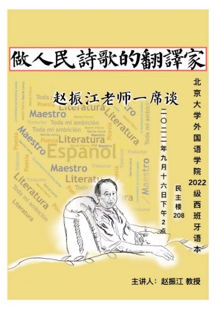 金秋九月,岁在壬寅,秋风送爽,朝气蓬勃。历经60多年沧桑变幻的北大西班牙语专业又迎来了新一届新生。大一伊始,正是初入燕园的学子们适应大学生活,确立未来人生目标的关键时期。为了让同学更迅速地融入燕园外院,更高效地学习西班牙语这门魅力无穷的语言,更好地传承北大西班牙语学科精神,22级西班牙语班很荣幸地邀请到了刚刚获得中国翻译协会“翻译文化终身成就奖”的赵振江教授给大一新生们作第一场“名家分享”讲座。