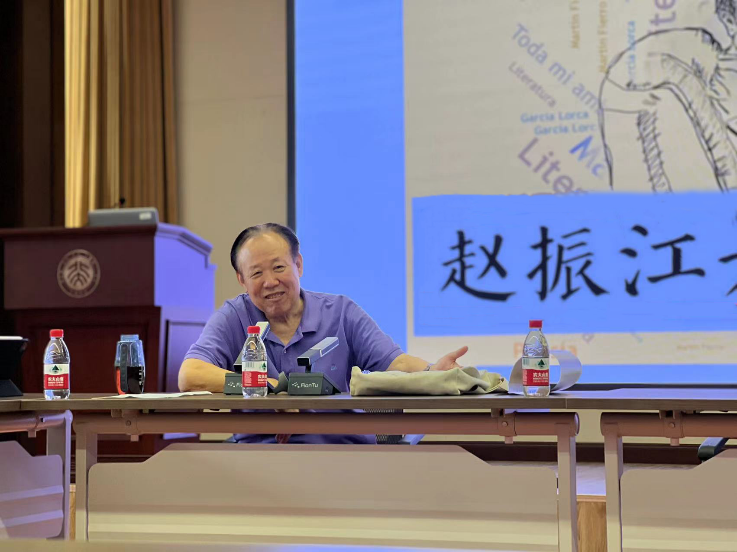 赵振江,原西方语言文学系主任,西班牙伊莎贝尔女王骑士勋章获得者。他不仅将胡安·鲁尔夫,鲁文·达里奥,略萨,聂鲁达,加西亚·洛尔卡等西语文学大师的作品译介到了国内,为国内的西语文学研究做出了开创性的工作;更将中国最伟大的古典名著《红楼梦》翻译成了西班牙语。