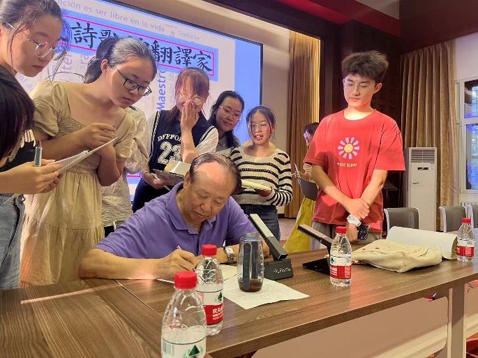 赵振江老师分享完自己的经历后,同学们先后就自己感兴趣的话题提问。其中,有的同学与赵老师聊到西班牙语学习对于文化交流,以及相关职业规划的影响。就这个方面,赵振江老师强调了外语作为桥梁的基础作用,同时点出了西班牙语在当前世界文化中的重要地位。杜文萱同学还问到了在翻译书籍时,作为译者如何能更好地复刻异域文化语境,展现更加原汁原味的作品。针对这个问题,赵老师举了《红楼梦》翻译中的例子。他提到在参加一个红学论坛时,曾讨论为什么英国翻译的《红楼梦》中把“怡红公⼦”翻作“怡绿公⼦”,是因为红在英国文化传统中是⾎腥暴⼒的颜⾊,⽽绿⾊则是⾼雅的。这种情况在翻译的过程中经常发生,赵振江老师指出“还是要贴合当地语境来⽅便当地⼈的阅读,但同时有必要增加注释来展现中国的⽂化本⾊。”此外,新生们还向赵老师咨询了西语学习小窍门,语言文学学习动力的探索等一系列问题,场面热烈。