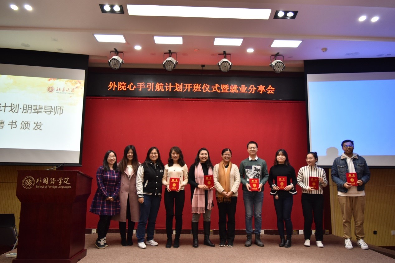 随后,团委书记王艳超、亚非系系主任魏丽明教授以及研究生会就业部部长王静妍向外国语学院“心手计划”朋辈引航导师颁发聘书并合影留念。首届外国语学院“心手计划”朋辈引航导师团共设7名,分别是:09届东南亚文化硕士毕业生、创新地图公司副总裁赵嵩;17届东南亚文化硕士毕业生、就职于字节跳动公司的马宇晨;17届东南亚文化硕士、任职于外交部的宋妍若然;15届英语翻译硕士、就职于中国工商银行总部的白艺茹; 16届日语翻译硕士、任职于中国银行总部的王晗;16届日语翻译硕士、就职于安永会计事务所的段愿;16届英语翻译硕士、就职于北京十一学校的唐梦莲。