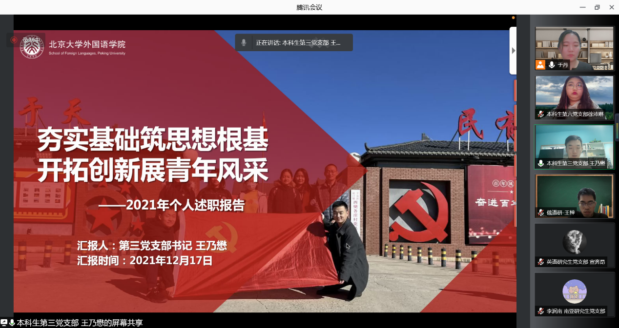 为充分发挥党支部基层战斗堡垒作用,激发党员引领示范效应,12月17日晚,外国语学院召开2021年度学生党支部书记工作交流会,本次交流会采用腾讯会议线上开展,会议邀请到党委书记李淑静、党委副书记王恒、团委书记伍昕钰。会议由团委常务副书记于丹主持,18名学生党支部书记参加会议。