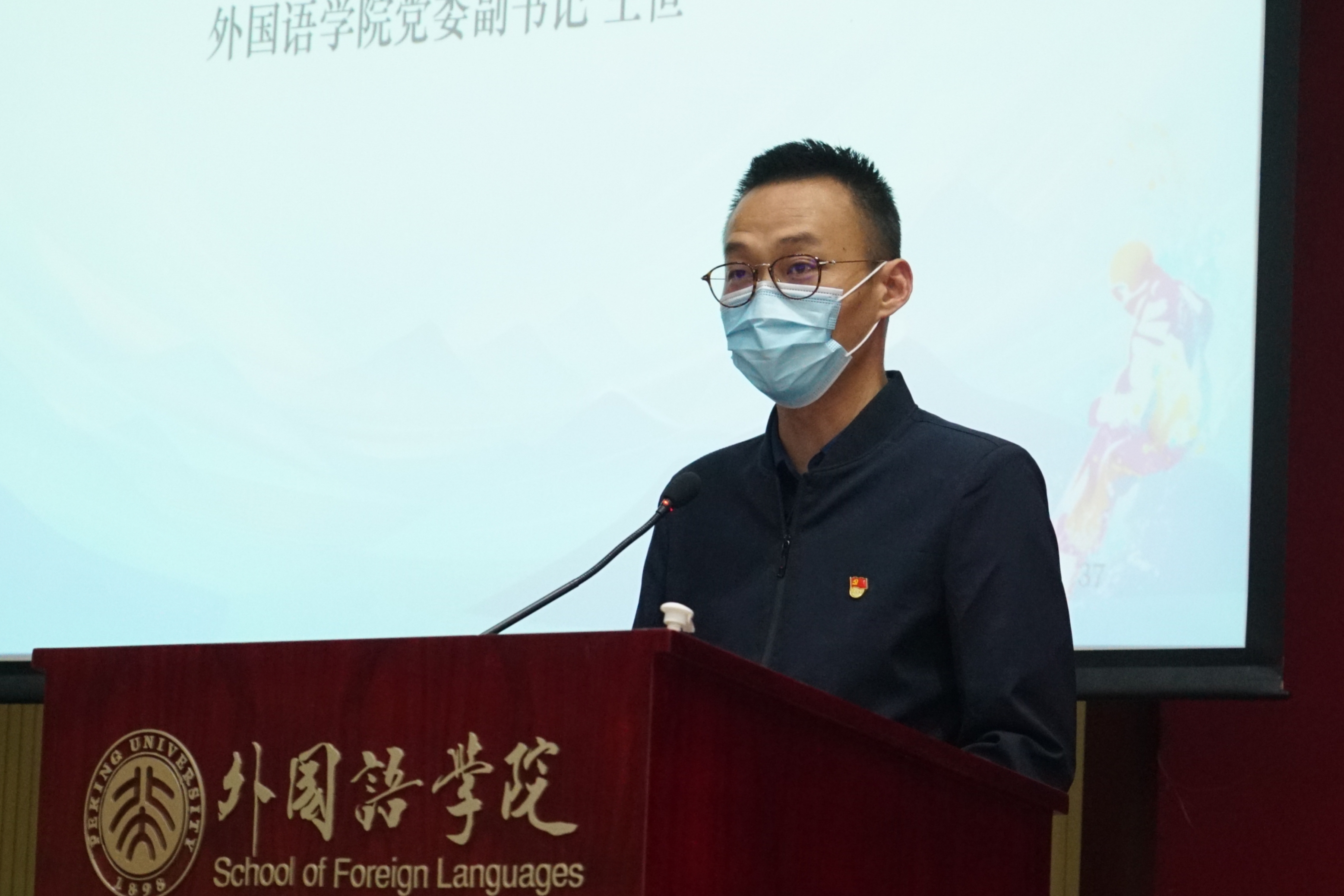 校团委副书记鞠晓代表校团委向完成冬奥会和冬残奥会的外院师生致以了诚挚的感谢和崇高的敬意。他指出,外国语学院冬奥志愿者团队人数在全校各院系名列前茅,是北大不可或缺的主力军,并激励外院学子继续与党同心、与国同行,让青春之花绽放在党和人民最需要的地方。