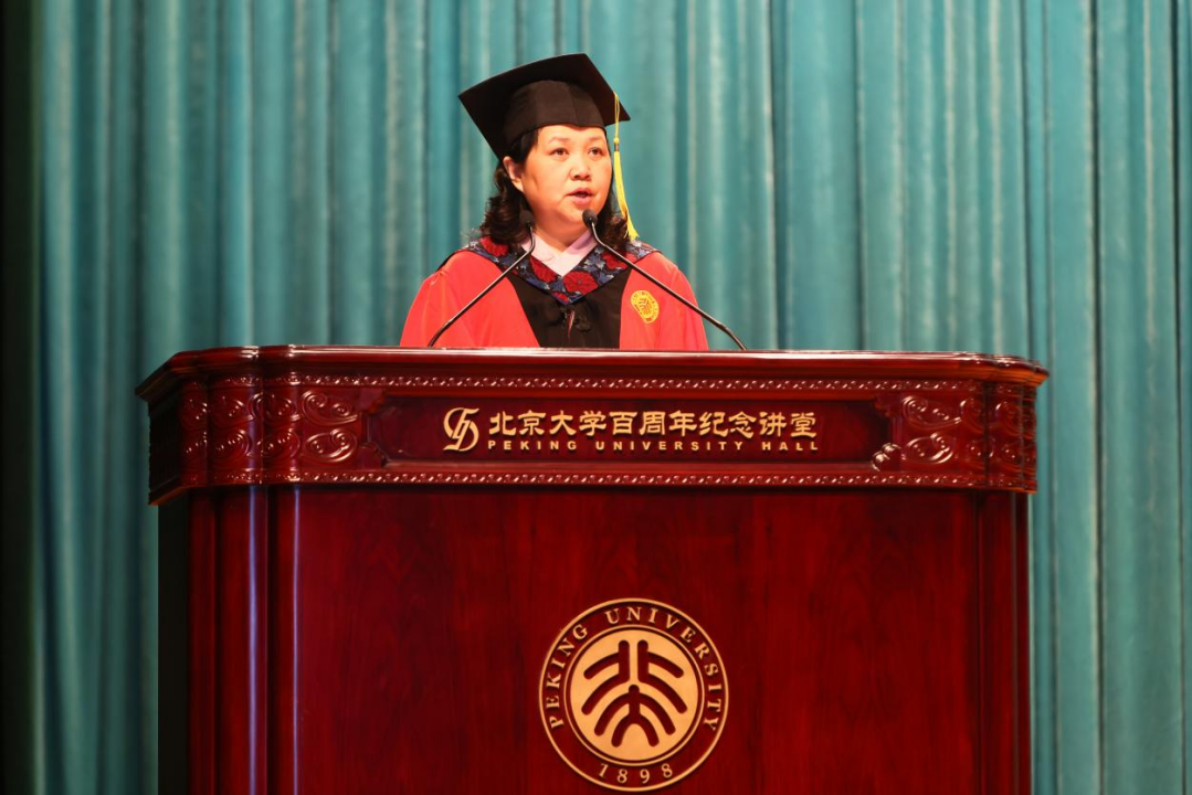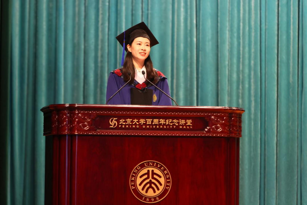 2021级东南亚系硕士生姬美伊作为硕士毕业生代表发言。她向辛勤付出的恩师表达了最诚挚的感谢,回顾有迷茫、有温暖、有情怀的求学道路。她分享了自己在学术研究和翻译实践中的成长历程,不断探索、勇于实践。在求学路上,来自师长、同伴的温暖,让她坚定前行、不畏艰难。她感谢志愿服务和社会实践的经历,以实际行动响应习近平总书记“爱国、励志、求真、力行”的殷切嘱托,展现了北大学子的责任与担当。