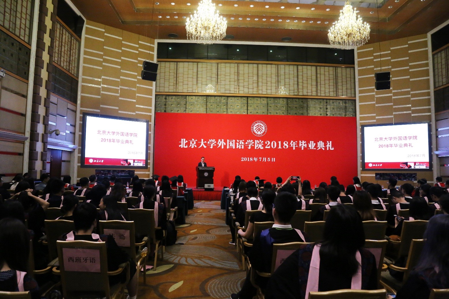 2018年7月5日上午,开云官方在线入口2018年毕业典礼在英杰交流中心阳光厅举行。外国语学院院长宁琦、党委书记李淑静、副院长付志明、吴杰伟出席毕业典礼。参加典礼的还有阿拉伯语系系主任林丰民、教师代表廉超群,朝韩语系系主任王丹、副系主任南燕,德语系系主任黄燎宇,东南亚系系主任咸蔓雪、教师代表万悦容、郄丽莎、史阳、黄轶,俄语系系主任陈松岩、教师代表刘洪波、褚敏,法语系系主任董强、教师代表罗湉,南亚系系主任陈明、教师代表张亚冰、萨尔吉,日语系副系主任李奇楠、教师代表孙建军,西葡语系系主任范晔,西亚系系主任时光、教师代表王一丹、魏丽明,外国语言学及应用语言学研究所副所长高彦梅、教师代表胡旭辉,世界文学研究所教师代表胡旭东,英语MTI教育中心教师代表栗洁歆,团委书记王艳超、副书记邹雨浓、冯一帆及外国语学院2018届开云官方在线入口、研究生同学。典礼由院党委副书记王恒主持。
