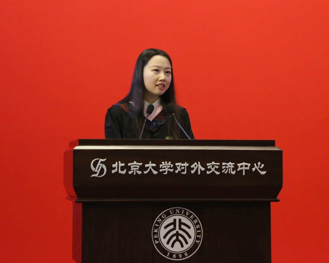 阿拉伯语系2015级硕士生满园则代表研究生毕业生发表了毕业感言。她情深地回忆了初入燕园的那份感动与好奇,其中既包含对燕园一草一木的眷恋不舍,从北大的湖光塔影、慵懒猫咪到外文楼前盛放的西府海棠;更浸透着对勤勉不怠的恩师、可爱可为的同窗的诚挚热爱。她在发言中表达,愿同学们都能心怀赤诚、坚守初心,在迈向未来之时不忘母校的恩泽和共同肩负的使命。