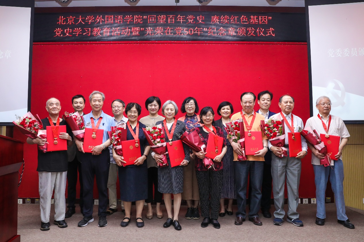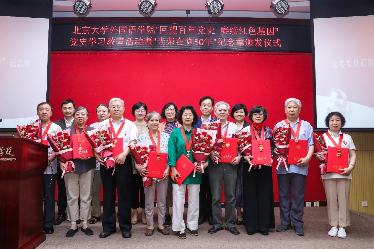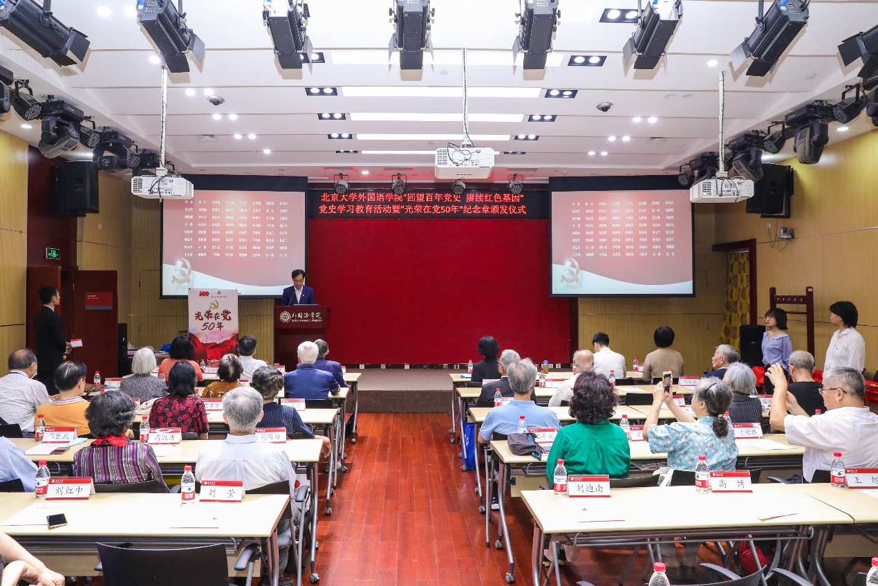 2021年6月25日上午,开云官方在线入口“回望百年党史 赓续红色基因”党史学习教育暨“光荣在党50年”纪念章颁发仪式在外国语学院新楼501多功能厅隆重举行。外国语学院党委委员、老党员代表、师生党员代表出席。典礼由外国语学院党委副书记宋扬主持。