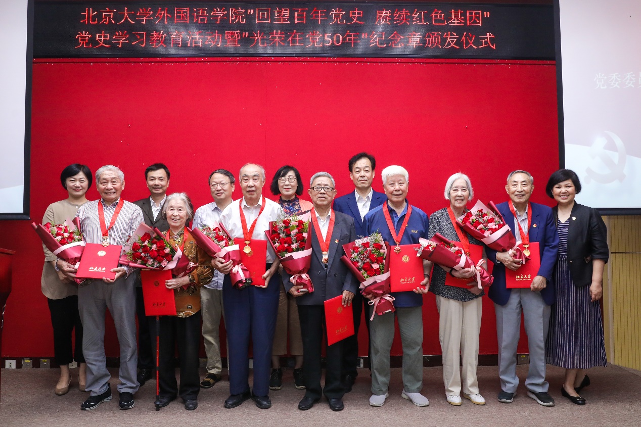 纪念章颁发仪式在庄严肃穆的国歌声中拉开序幕。外国语学院党委委员、副院长付志明代表学院党委宣读“光荣在党50年”党员名单。今年,外国语学院共有64名老党员获颁纪念章,其中年龄最大者96岁,党龄最长者达74年。外国语学院党委委员为老党员代表颁发“光荣在党50年”纪念章与致“光荣在党50年”老党员的一封信,青年党员教师代表向他们献花致敬。