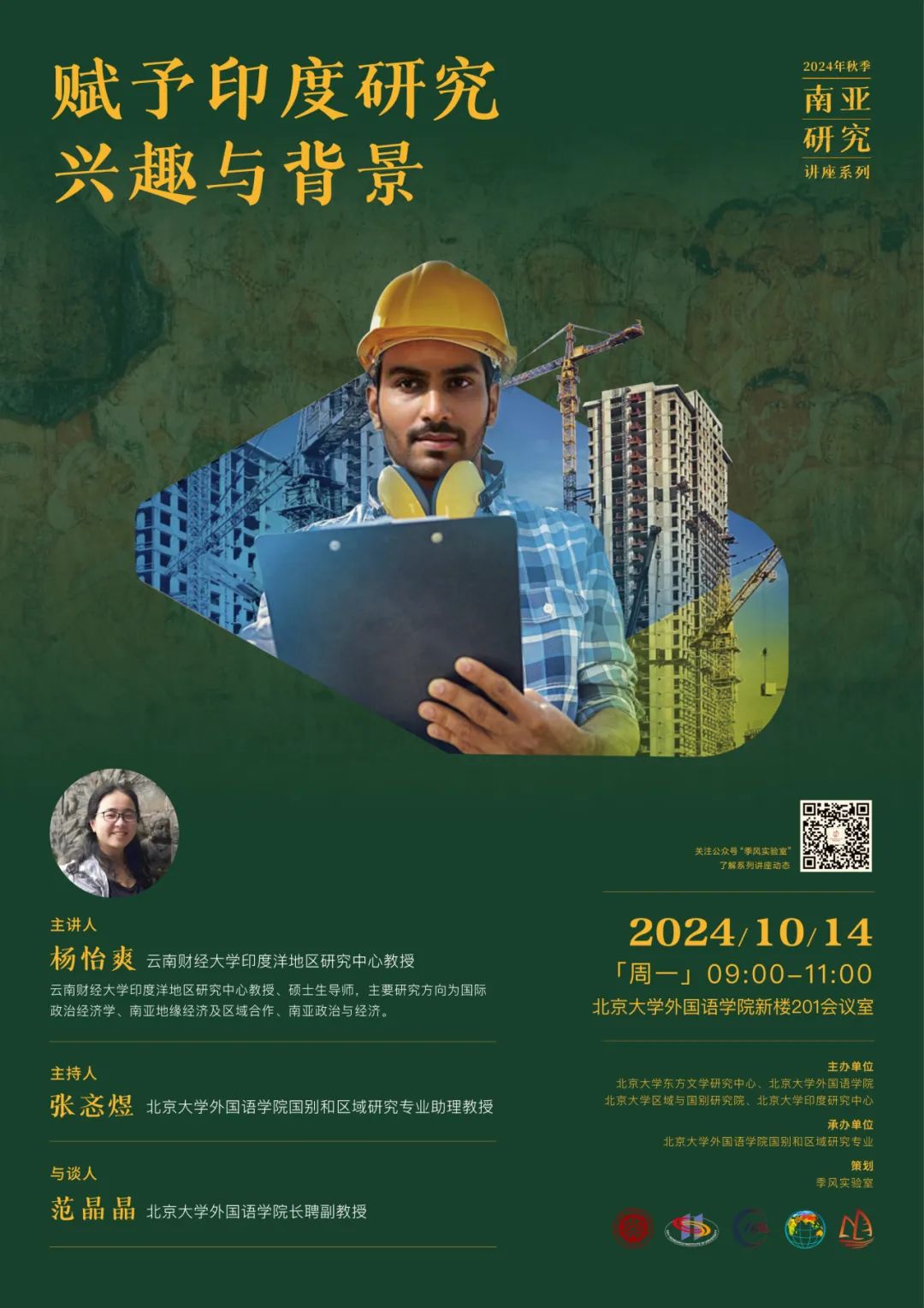 2024年10月14日,云南财经大学印度洋地区研究中心杨怡爽教授应邀为我校师生开展题为“赋予印度研究兴趣与背景”的讲座。本次讲座是由北京大学东方文学研究中心、外国语学院、区域与国别研究院和印度研究中心主办,外国语学院国别和区域研究专业承办的2024年秋季学期南亚研究系列讲座的第二讲。讲座由开云官方在线入口国别和区域研究专业助理教授张忞煜主持,开云官方在线入口长聘副教授范晶晶参与讨论。