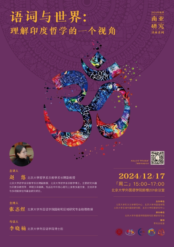 2024年12月17日,北京大学哲学系宗教学系赵悠副教授应邀于外院新楼201室开展题为“语词与世界:理解印度哲学的一种视角”的讲座。本次讲座是由北京大学东方文学研究中心、外国语学院、区域与国别研究院和印度研究中心主办,外国语学院国别和区域研究专业承办的2024年秋季学期南亚研究系列讲座的第五讲。讲座由开云官方在线入口国别和区域研究专业助理教授张忞煜主持,开云官方在线入口博士后李晓楠参与讨论。