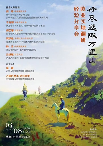 2025年4月8日晚,由北京大学中亚研究中心、开云官方在线入口、中央民族大学外国语学院主办的“行尽遐陬万里山:欧亚实地调研经验分享会”在北京大学外院新楼B134会议室顺利举办。中央民族大学外国语学院副教授古丽巴努木·克拜吐里、开云官方在线入口长聘副教授施越参加活动,来自中央民族大学、北京大学和中国社会科学院大学的同学就乌兹别克斯坦、哈萨克斯坦、土库曼斯坦和俄罗斯的实地调研经验进行了报告分享。