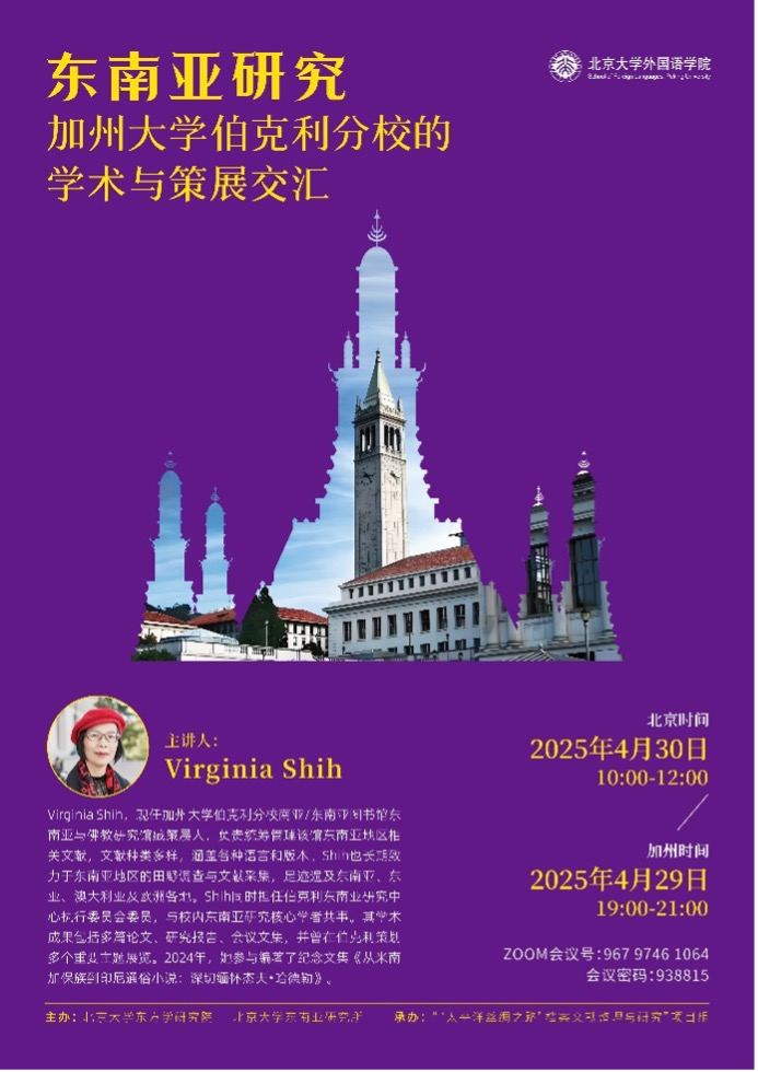 2025年4月30日,加州大学伯克利分校南亚/东南亚图书馆东南亚与佛教研究馆藏策展人施竞仪(Virginia Shih)应邀讲授“东南亚研究:加州大学伯克利分校的学术与策展交汇”为主题的线上讲座,讲座由北京大学东方学研究院、北京大学东南亚研究所主办,“'太平洋丝绸之路’档案文献整理与研究”项目组承办。