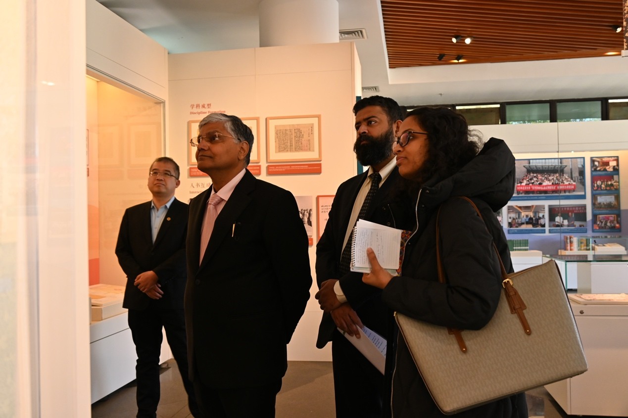 会见后,罗国栋一行移步至北京大学校史馆,在北京大学档案馆、校史馆馆长余浚陪同下,参观“百年回眸:北大的印度学学科建设与中印人文交流展”,外国语学院南亚学系博士生郭家誉为嘉宾详细导览。展览通过珍贵文献、历史照片及学术成果,系统梳理了北京大学印度学学科百年发展历程,展示了历代北大学者在印度宗教、哲学、文学、图像学、语言教学等领域的丰硕成果。北大的印度学科不仅是中国早期东方学的重要组成部分,也为中国东方学学科的建设和发展树立了标杆,并将继续为新时代的印度学学科建设发挥关键作用。观展结束后,罗国栋为北京大学校史馆写下亲笔留言,并与接待嘉宾合影留念。