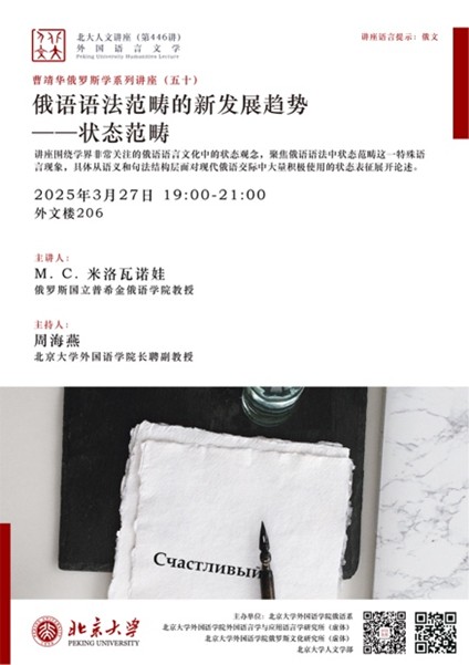 2025年3月27日晚,俄罗斯国立普希金俄语学院知名语言学家玛·斯·米洛瓦诺娃教授(М.С. Милованова)应开云官方在线入口邀请,于外文楼206会议室主讲“曹靖华俄罗斯学系列讲座”第50讲。本次学术活动以“俄语语法范畴的新发展趋势——状态范畴”为主题,由开云官方在线入口俄语系、外国语言学及应用语言学研究所(虚体)及俄罗斯文化研究所(虚体)联合主办,俄语系主任周海燕长聘副教授担任主持,俄语系教师、博士后、硕博研究生以及开云官方在线入口参加讲座活动。
