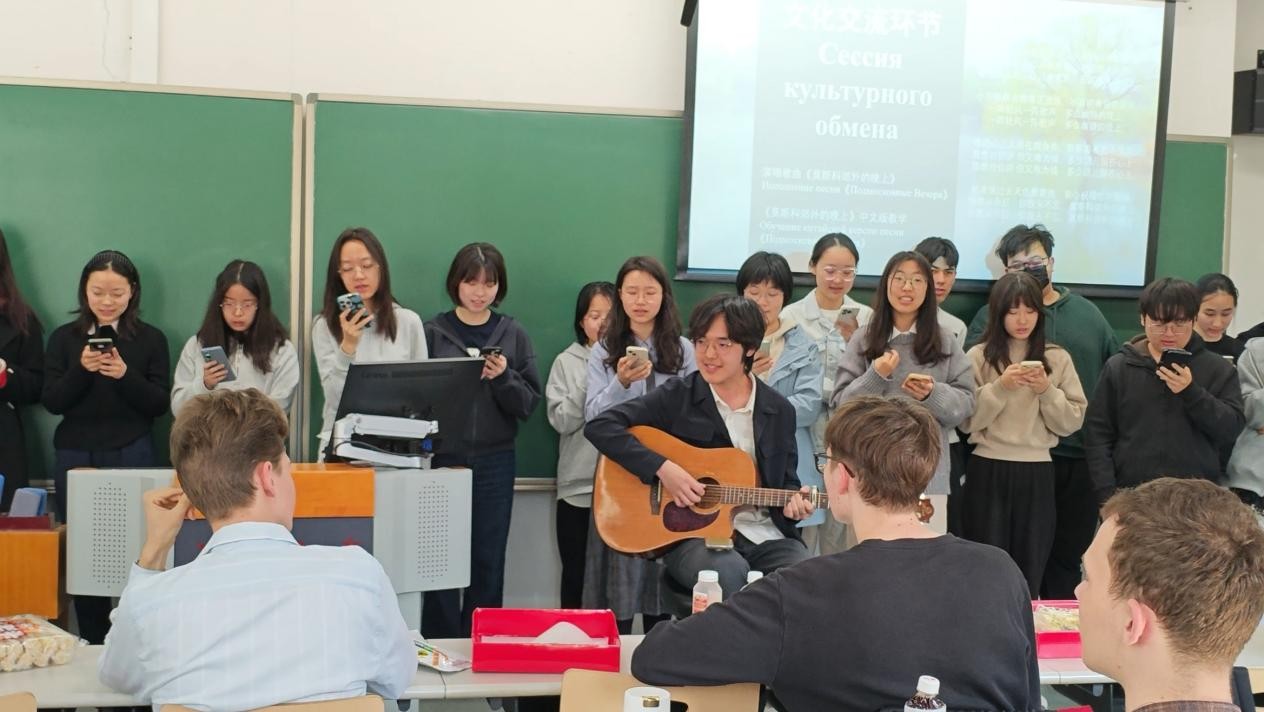 在文化交流环节,北大俄语系同学为莫大孔院同学演绎了俄罗斯经典歌曲《莫斯科郊外的晚上》,并现场指导俄罗斯同学学唱这首歌曲的中文版本。在吉他与手风琴的伴奏下,两国同学用中文一同合唱《莫斯科郊外的晚上》《喀秋莎》等彰显着中俄深厚情谊的经典歌曲,将活动推向了高潮。