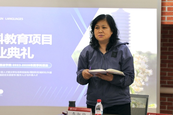 李淑静作总结发言。她谈到,外国语学院秉承着北大一直以来包容、开放、卓越的特点与精神,以及充分发挥着在跨学科人才培养上展现出来的前瞻性、引领性的作用。她强调,项目的成功结业不是终点,而是学员们运用跨学科思维服务社会、引领未来的新起点,在科技革命和产业变革加速的今天,跨学科思维和能力已成为未来领军人才的核心素养,并勉励全体结项同学,希望他们将在项目中学到的语言能力、融合思维、创新方法内化于心、外化于行,始终牢记“世界在我脚下,祖国在我心中”的使命,为中国发出世界强音不懈奋斗,成长为有过硬专业、人文情怀、社会责任感和历史使命感的“外院人”。最后,刘建波、李淑静和各项目导师向本届结业学员颁发结业证书和纪念品,结业式在热烈的掌声中圆满结束。