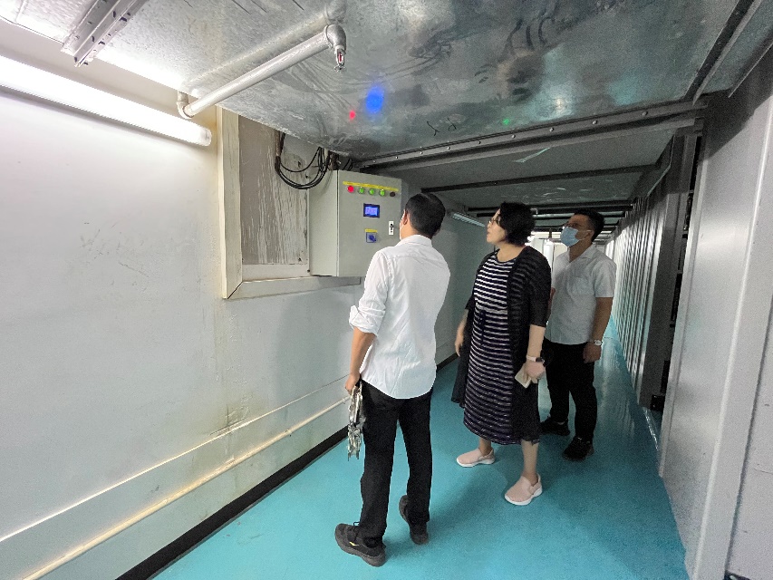张冬梅老师在物业工作人员的陪同下首先对新楼的中控室进行了检查。物业人员表示,为了应对汛期紧急情况,物业已于此前购置了防汛应急物资,如头灯、应急防水服以及雨鞋等装备。物业工作人员还进行了头灯使用的操作示范,头灯可以在汛期突发停电等意外情况时为工作人员提供应急照明服务,在一定程度上保证工作人员的操作安全。