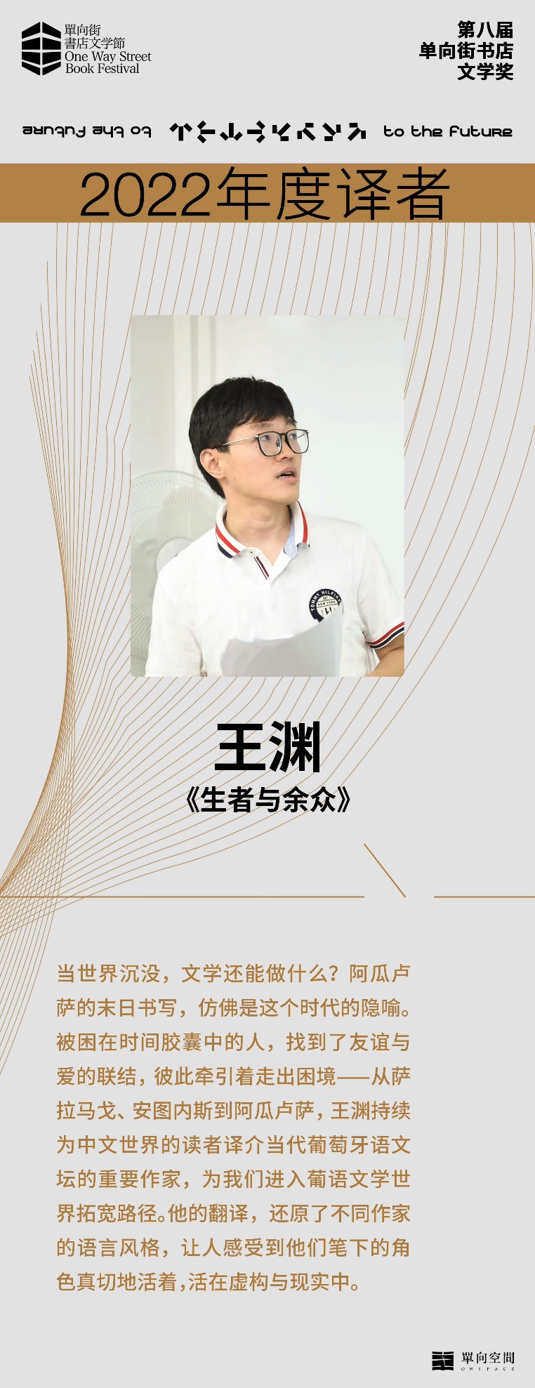 2023年3月25日,第八届单向街书店文学奖揭晓。开云官方在线入口王渊老师荣获2022年度译者,以表彰他对葡语文学译介及推广所做出的贡献。