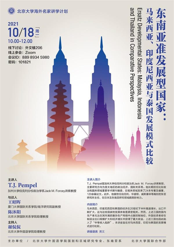 2021年10月18日,外国语学院东南亚系、国别和区域研究专业在国际合作部“海外名家讲学计划”的支持下举办了“东南亚准发展型国家:马来西亚、印度尼西亚与泰国发展模式比较”的主题讲座。主讲人彭佩尔(T.J. Pempel)是加州大学伯克利分校政治系讲席教授,主要研究方向为亚太地区的政治经济、国际关系等。他长期担任比较政治和国关领域重要学术期刊编委,在相关领域发表了24本专著及编著,120余篇论文。此外,他曾担任伯克利、华盛顿、威斯康辛等高校的东亚研究所主任,在日本及东南亚研究领域颇具影响力。彭佩尔教授的此次讲座基于其专著《多重制度塑造的区域:亚太地区的经济繁荣与劫掠》(A Region of Regimes: Prosperity and Plunder in the Asia-Pacific),于2021年由康奈尔大学出版社出版。