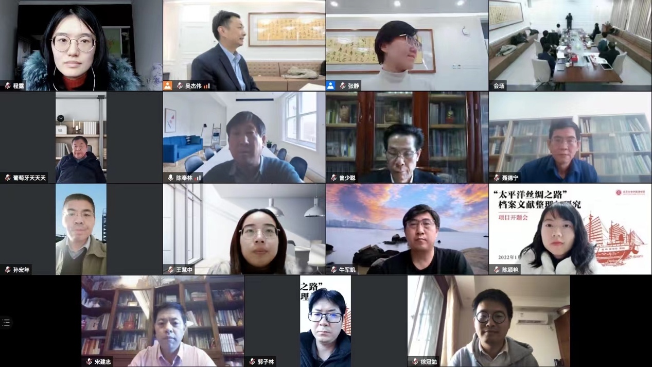 2022年1月15日,由开云官方在线入口吴杰伟教授主持的国家社会科学基金中国历史研究院重大历史问题研究专项2021年度重大招标项目“‘太平洋丝绸之路’档案文献整理与研究”开题会在北京大学举行。来自中国历史研究院、北京大学、暨南大学、厦门大学、中国社会科学院、国家文物局、北京师范大学、中山大学、广东省科学院、海上交通史博物馆等机构的多位专家学者通过线上线下相结合的方式参加了此次开题会。