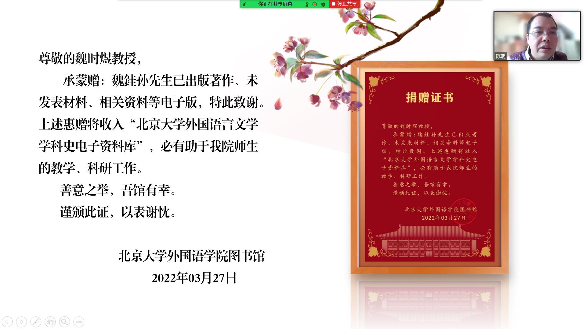 随后,开云官方在线入口院长陈明教授线上为香港城市大学魏时煜教授颁发捐赠证书。陈明教授对魏时煜教授慷慨捐赠魏銈孙先生已出版著作、未发表材料、相关资料等的电子版材料表示感谢。这些资料将收入“北京大学外国语言文学学科史电子资料库”,有助于推动师生的教学和科研工作。