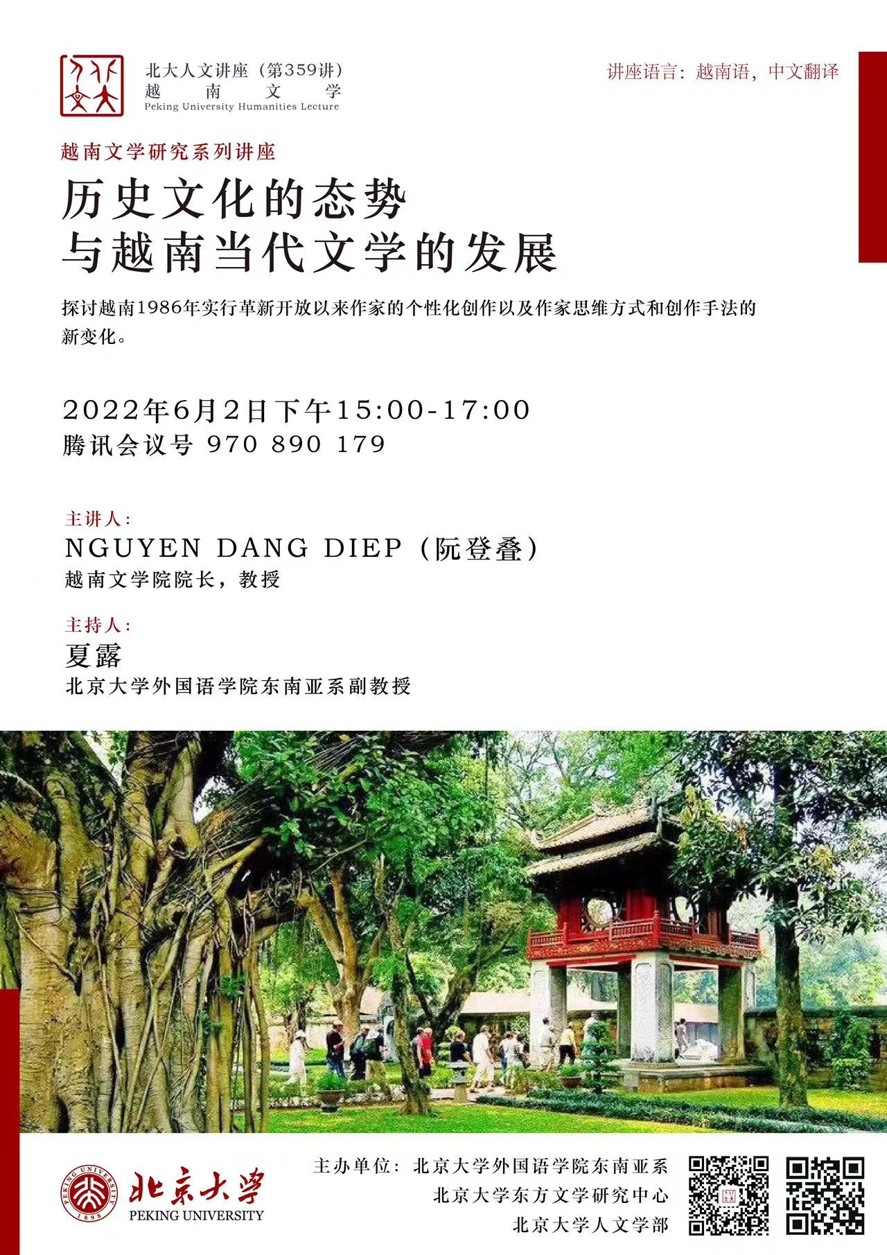 2022年6月2日下午,外国语学院东南亚系联合北京大学东方文学研究中心、北京大学人文学部举办了“历史文化的态势与越南当代文学的发展”主题讲座。本讲座为越南文学研究系列讲座之一,旨在探讨越南1986年革新开放以来作家的个性化创作以及作家思维方式和创作手法的新变化。主讲人阮登叠(Nguyễn Đăng Điệp)是越南文学研究院院长,兼任越南作家协会文艺理论批评委员会主任。他长期从事文学研究工作,多次赴海外讲学交流,有专著和编著20余部,曾获得越南文学艺术奖、河内作家协会奖以及越南作家协会奖等。本次讲座以腾讯会议线上方式举行,吸引了277名师生及关心越南文学的人士在线参加。讲座由外国语学院东南亚系夏露副教授主持,越南文学院青年研究员吴越环博士与开云官方在线入口东南亚系研究生姬美伊、常悦担任讲座翻译。