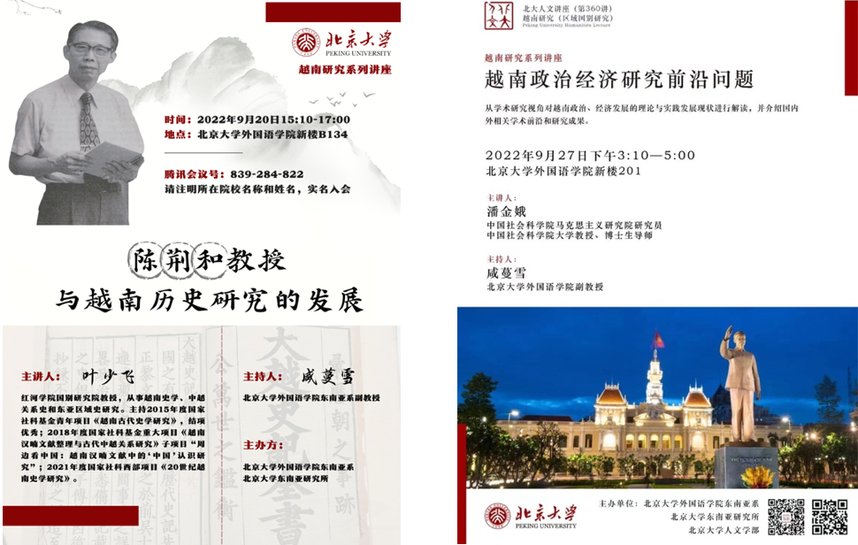 ​  2022年9月20日与27日,外国语学院东南亚系越南语专业在外国语学院和北大人文学部支持下,举办越南研究系列讲座,分别邀请红河学院叶少飞教授做了题为“陈荆和教授与越南历史研究的发展”的讲座,邀请中国社会科学院潘金娥研究员做了题为“越南政治经济研究前沿问题”的讲座。系列讲座以线上线下相结合的方式进行,吸引了上百位关心越南研究的国内外高校和科研机构师生在线听讲和互动。
