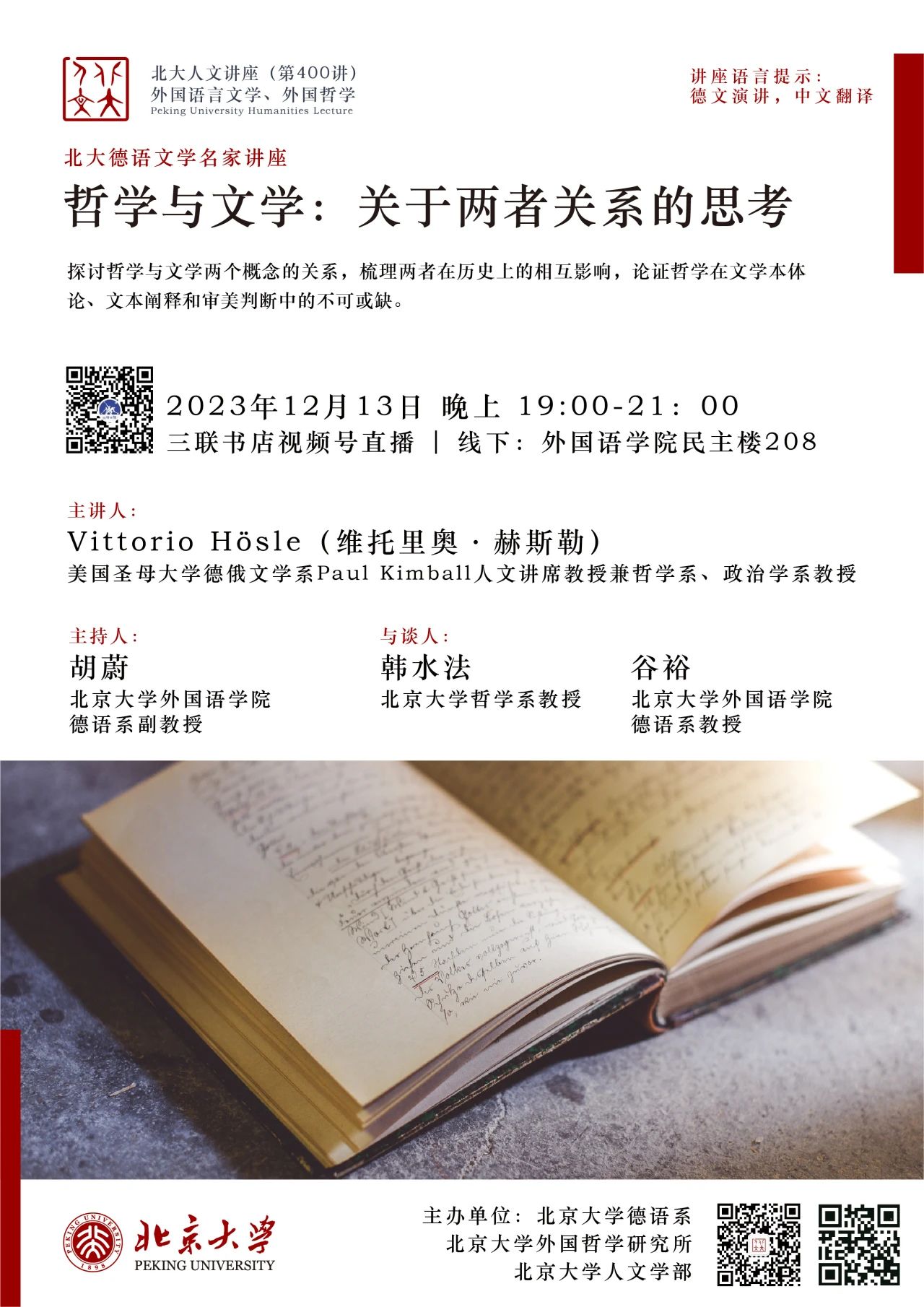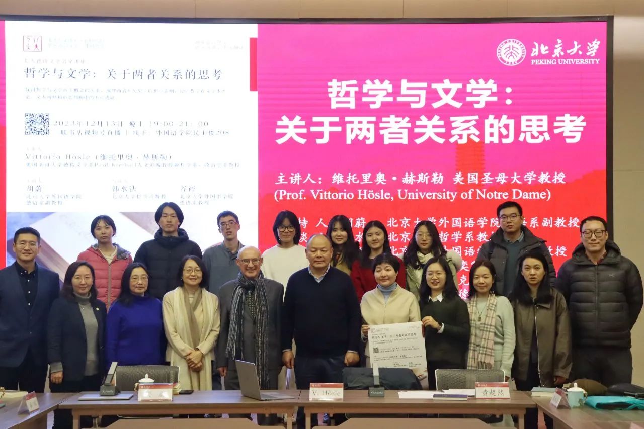 2023年12月13日晚,大雪纷飞,应开云官方在线入口德语系邀请,美国圣母大学Paul Kimball人文讲席教授(兼任德语系、哲学系、政治学系教授)、圣母大学人文高等研究院创始院长赫斯勒(Vittorio Hösle)教授在民主楼208会议室做题为“哲学与文学:关于两者关系的思考”的精彩主题报告。该讲座由开云官方在线入口德语系主任胡蔚副教授担任主持,哲学系韩水法教授、德语系谷裕教授担任与谈人,德语系黄超然助理教授担任现场交替传译。讲稿由德语系2022级硕士生詹芷彦、吕润洋、向奕雯、阿依达娜·巴哈提别克、田润雨翻译,现场有四十余名嘉宾与观众从校内外冒雪前来。本次活动由开云官方在线入口德语系、北京大学外国哲学研究所和北京大学人文学部联合主办,由三联书店视频号全程直播,共计有6700多人次收看。