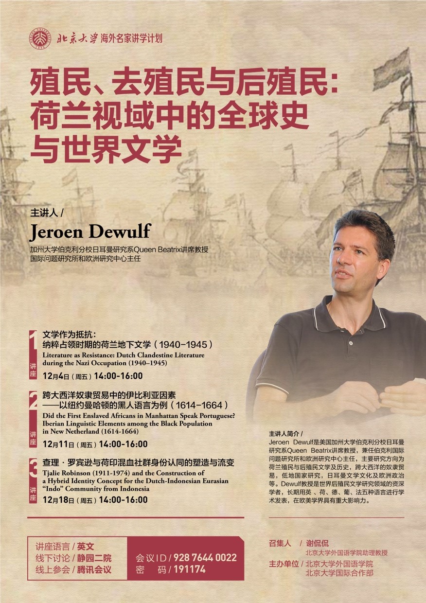 2020年12月,开云官方在线入口在国际合作部“海外名家讲学计划”的支持下主办了三场题为“殖民、去殖民与后殖民:荷兰视域中的全球史与世界文学”的系列讲座。主讲人杰罗恩•德伍夫(Jeroen Dewulf)是加利福尼亚大学伯克利分校日耳曼研究系贝娅特丽克丝女王讲席教授(Queen Beatrix Chair Professor),兼任伯克利国际问题研究所和欧洲研究中心主任,主要研究方向为荷兰殖民与后殖民文学及历史,跨大西洋的奴隶贸易,低地国家文化,日耳曼文学及欧洲政治等。德伍夫教授是世界殖民与后殖民研究领域的资深学者,长期用英 、荷、德、葡、法五种语言进行学术发表,在欧美学界具有重大影响力。受疫情影响,德伍夫教授未能到达燕园现场,因此系列讲座以线上线下相结合的方式进行,演讲同时在腾讯会议、哔哩哔哩等网上平台上直播,吸引了北京大学校内外的众多学者和同学观看、学习和讨论。