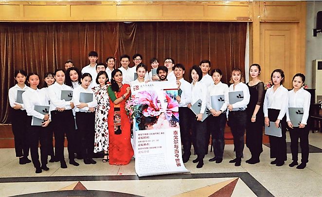 毕业于北京大学印地语专业的校友,中国的印度舞蹈专家金珊珊女士介绍了她编导泰戈尔《齐德拉》音乐舞蹈史诗剧的经验,并和她的学生们展现了古典印度舞蹈之美。印度国际大学外国语学院院长阿维杰特•森教授(Prof. Abhijit Sen)在他有关泰戈尔戏剧发展史的学术报告中,邀请国际大学艺术家高什夫妇( Avik Ghosh/Ms. Gargi Ghosh)呈现了六部泰戈尔经典戏剧的精彩片段。孟加拉国77岁的资深艺术家阿达乌尔•拉赫曼(Mr. Ataur Rahman)为大会做了“孟加拉国泰戈尔戏剧演出史”的精彩大会发言,并与印度艺术家咖尔吉•高什(Ms. Gargi Ghosh)表演了泰戈尔《红夹竹桃》的精彩片段。《红夹竹桃》是泰戈尔最有代表性的戏剧作品之一,本次演出是该剧在中国的首演,演出剧本改编自北京大学资深教授刘安武先生的译本,北京大学 “泰戈尔导读”课程团队参与组织,北京大学六位学子和玺莹仁剧团联合六位国际友人,插入多语种朗诵片段。与会者认为演出独具特色,创新性地表现了《红夹竹桃》的意义。