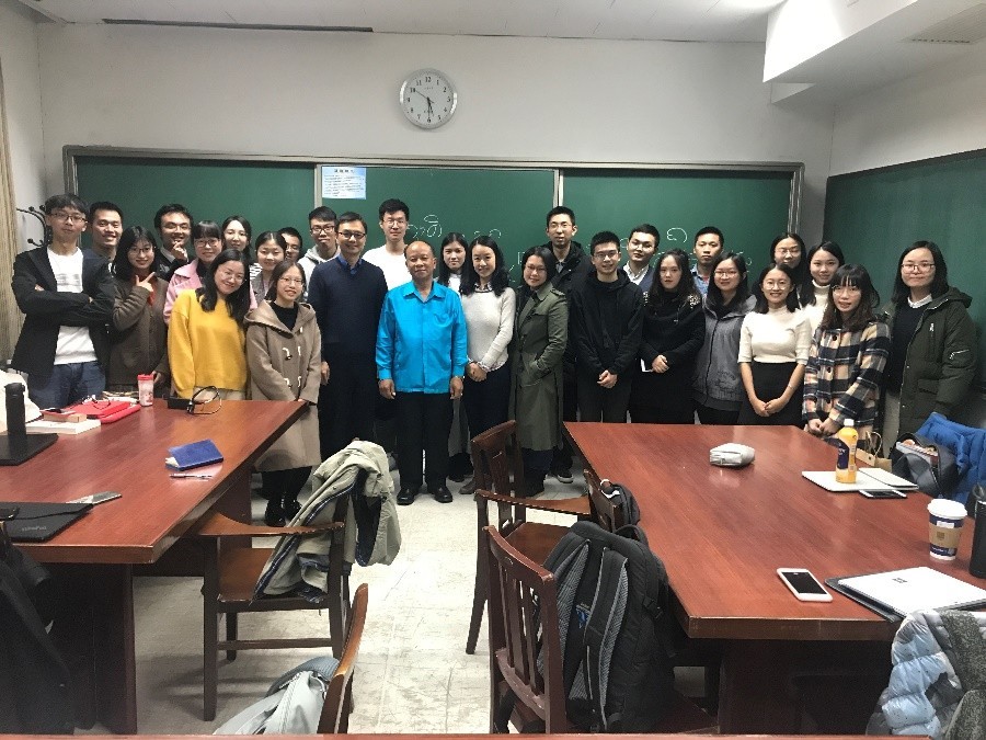 维宪•通塔维教授多次获得由老挝政府颁布的保卫及建设国家贡献奖、优秀教师奖等奖章,曾在老挝国内及泰国等地开展座谈与课程培训。讲座中,维宪•通塔维老师通过生动形象的例子,向大家展示了老挝文字的演变过程及发展脉络,并介绍了老挝记载经文的特殊文字“坦文字”。同时,维宪•通塔维老师就老挝的教育制度及留学情况做了介绍。