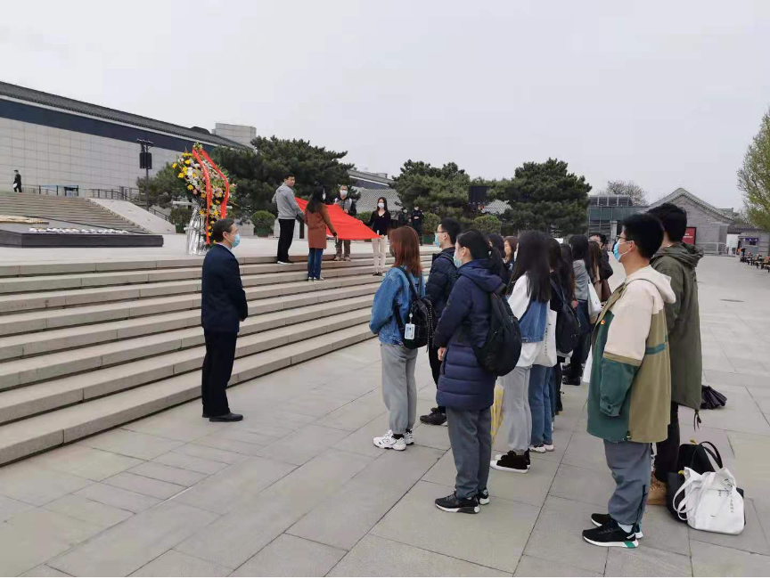 随后,在中国人民抗日战争纪念馆副馆长董立新和外国语学院院友吕曦的带领下,师生来到抗战馆进行实地学习。清明时节寄哀思,在董馆长的指引下,师生在独立自由勋章雕塑前向先烈默哀致敬。董馆长表示,在建党一百年的关键历史节点,我们当代中华儿女应当“缅怀英烈志 奋进新征程 ”, 在缅怀先烈、寄托哀思的同时,更应当砥砺奋进,在新的一百年中创造新的辉煌。