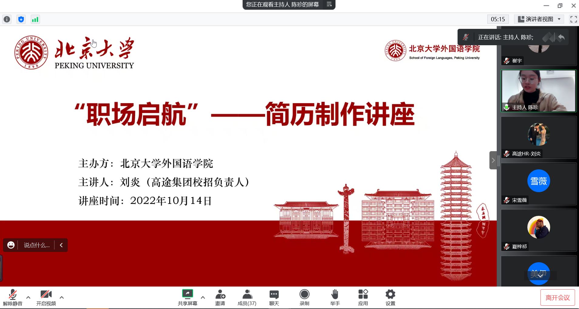 简历是求职的敲门砖,如何制作简历,突出自己的亮点,是毕业生求职必备的知识。为此,外国语学院特邀请高途集团高端校招负责人刘炎为求职路上的外院学子带来了简历制作方法和常见误区指导。10月14日下午,云端“职场启航”简历制作讲座活动通过腾讯会议顺利举行,学院党委副书记王恒、辅导员丁尧出席本次活动。